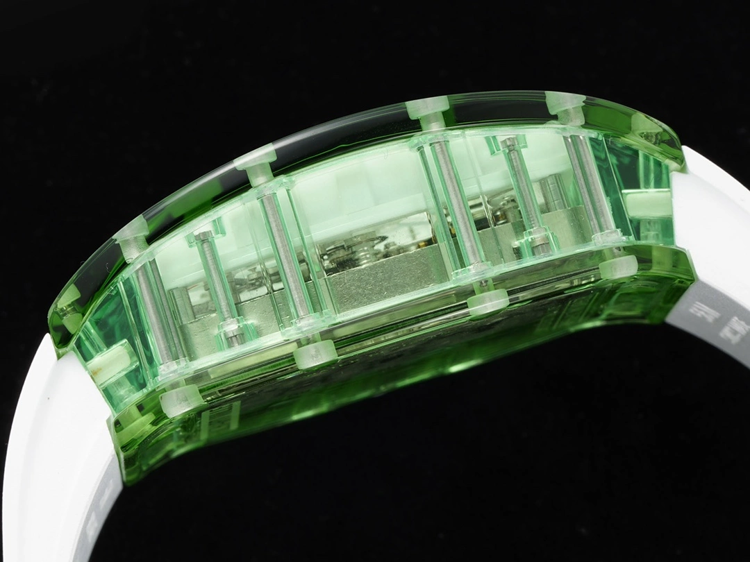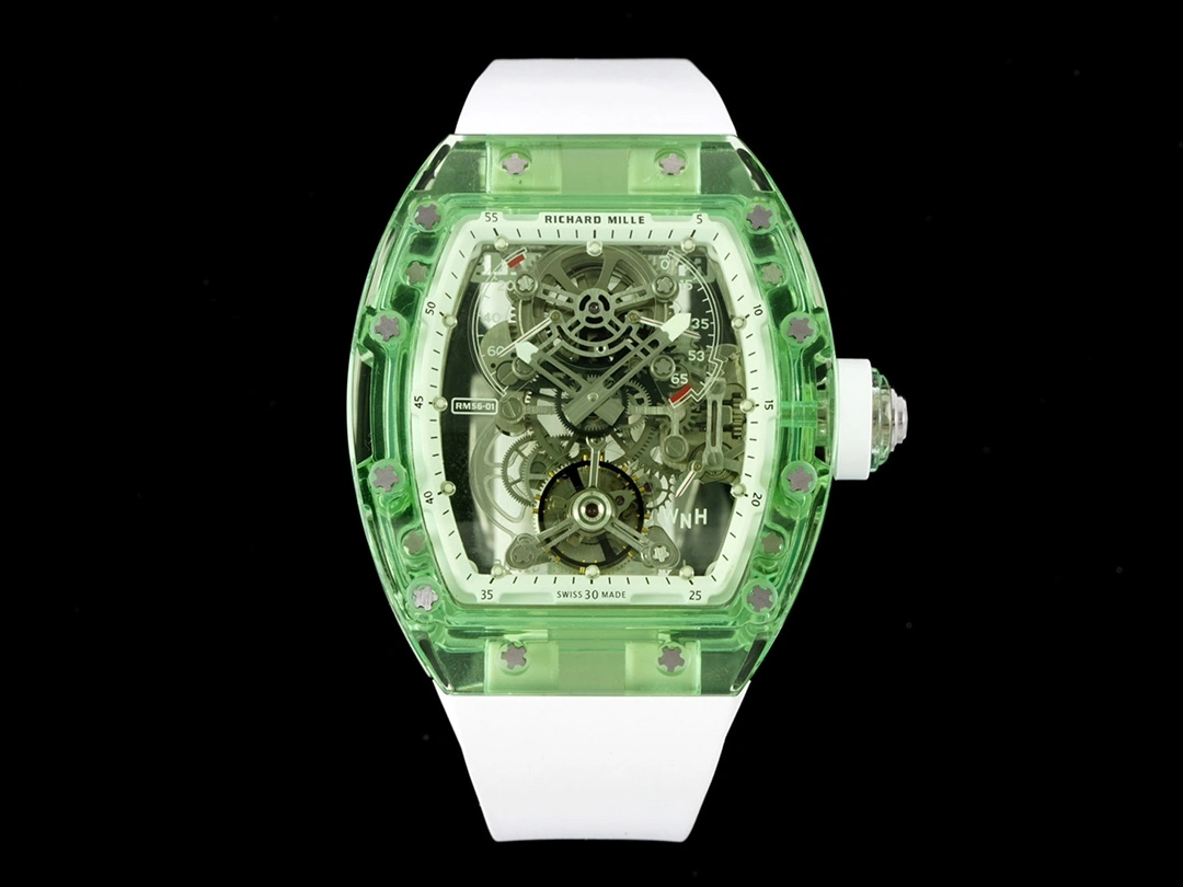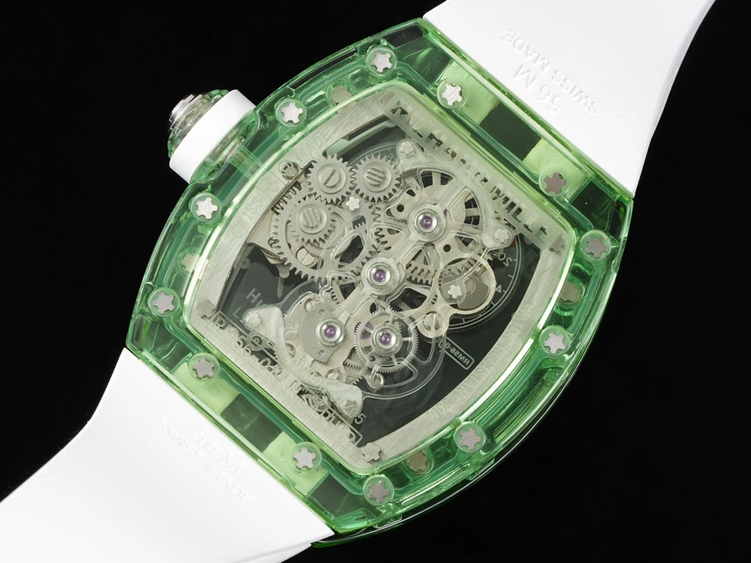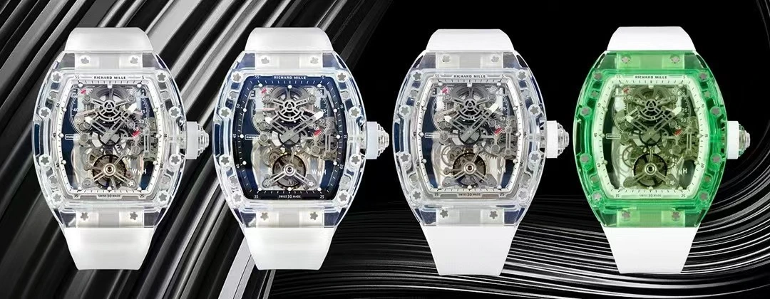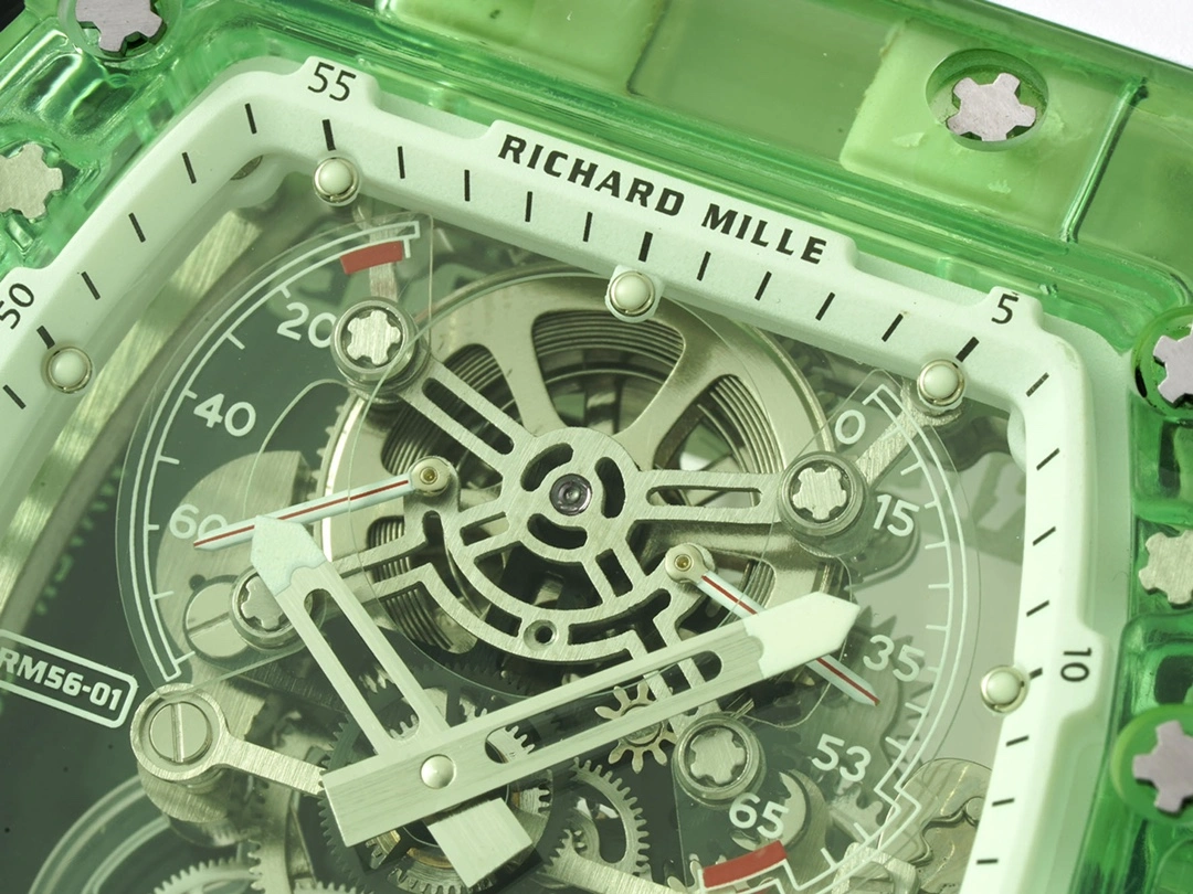 RM 56-01 What better way to demonstrate and prove the craftsmanship of a watchmaker than to make a crystal watch that is exquisite and can withstand the scrutiny of every detail from every angle? Not only does it require the precise dimensions of the components on the outside of the case, but also the precision of all the screws and joints inside the watch. The slightest imperfection is clearly visible from the outside, no matter how small it is. This is the pinnacle of watchmaking craftsmanship, and the RM56-01 will not disappoint. Richard Mille uses a transparent sapphire crystal plate to support the entire manual winding tourbillon movement, giving the RM56-01 a bright and moving appearance. The movement has a display of hours and minutes, a power reserve display and a torque indicator at 11 and 2 o'clock respectively, and a function selector at 4 o'clock. This pursuit of extreme transparency in a titanium movement also inspired the watchmaker's engineers to make the central bridge and third wheel in sapphire crystal. The surface of the central bridge is decorated with graining, which not only increases strength but also greatly reduces weight. The RM56-01 movement made of sapphire crystal and titanium can withstand drastic temperature changes and friction, and has amazing timing performance stability, which can be called a classic masterpiece of stopwatch. The RM56-01 crystal watch is the perfect masterpiece of Richard Mille's beautiful transparent movement technology. The processing of sapphire crystal is an extremely difficult top-level process, so the RM 56-01 is only issued in a very limited number of times.