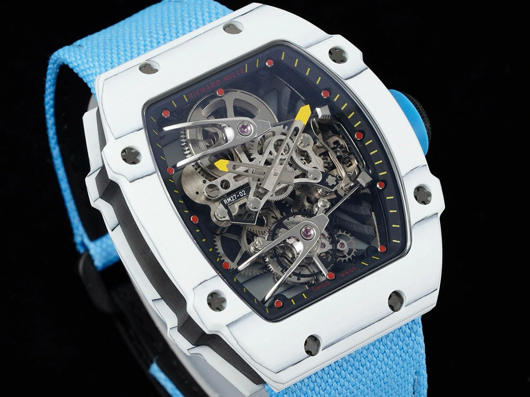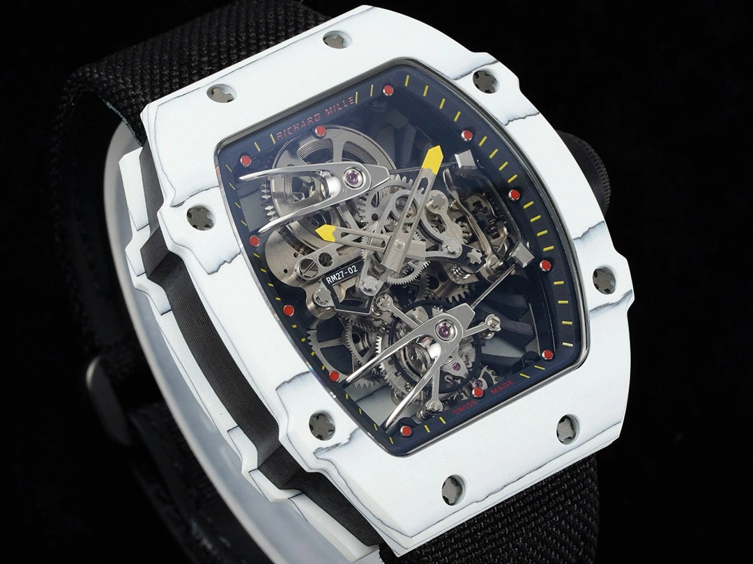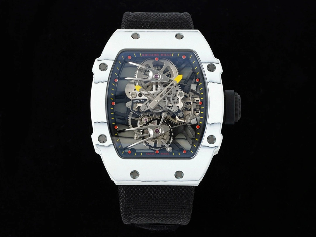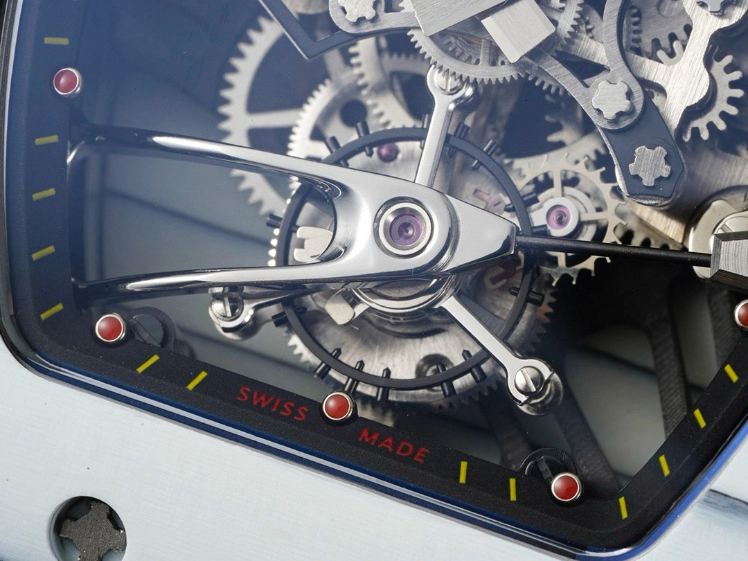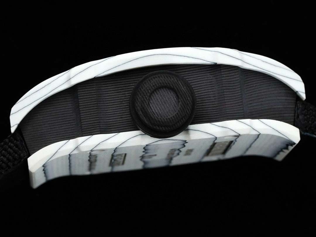 RICHARD MILLE was inspired by the chassis of the racing car and integrated the hollow main plate and case of the movement to greatly improve the impact resistance. In order to make the watch lighter, Richard Mille also cooperated with North Thin Ply Technology to develop a hard and wear-resistant "quartz fiber" ultra-light material to make the case. The weight of the whole watch is like thin paper and has the same rough texture as Damascus steel.