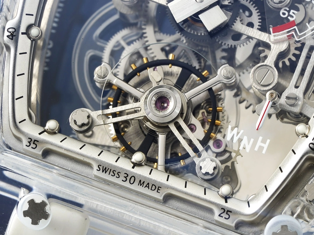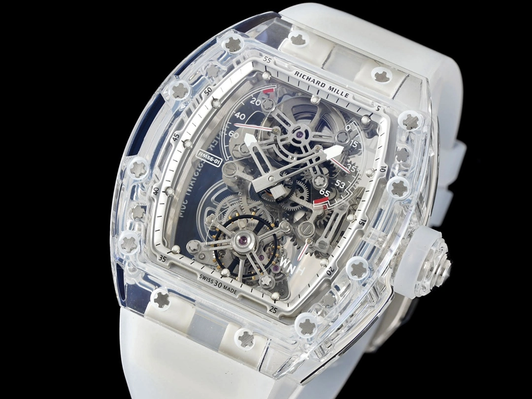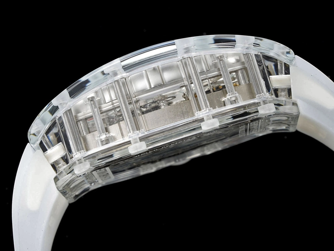 RM 56-01 What better way to demonstrate and prove the craftsmanship of a watchmaker than to make a crystal watch that is exquisite and can withstand the scrutiny of every detail from every angle? Not only does it require the precise dimensions of the components on the outside of the case, but also the precision of all the screws and joints inside the watch. The slightest imperfection is clearly visible from the outside, no matter how small it is. This is the pinnacle of watchmaking craftsmanship, and the RM56-01 will not disappoint. Richard Mille uses a transparent sapphire crystal plate to support the entire manual winding tourbillon movement, giving the RM56-01 a bright and moving appearance. The movement has a display of hours and minutes, a power reserve display and a torque indicator at 11 and 2 o'clock respectively, and a function selector at 4 o'clock. This pursuit of extreme transparency in a titanium movement also inspired the watchmaker's engineers to make the central bridge and third wheel in sapphire crystal. The surface of the central bridge is decorated with graining, which not only increases strength but also greatly reduces weight. The RM56-01 movement made of sapphire crystal and titanium can withstand drastic temperature changes and friction, and has amazing timing performance stability, which can be called a classic masterpiece of stopwatch. The RM56-01 crystal watch is the perfect masterpiece of Richard Mille's beautiful transparent movement technology. The processing of sapphire crystal is an extremely difficult top-level process, so the RM 56-01 is only issued in a very limited number of times.